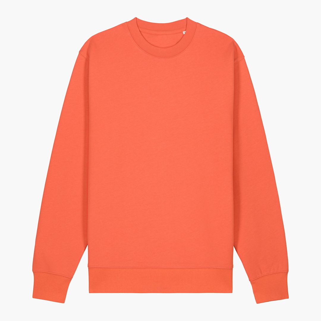 Unisex crew neck sweatshirt. 100% brushed cotton - Organic Ring Spun Combed, Fabric washed, 350 GSM. Self fabric Half moon at back neck. Single needle topstitch at neck collar. 2 needle topstitch centred on seam at hem, cuff and armhole.
