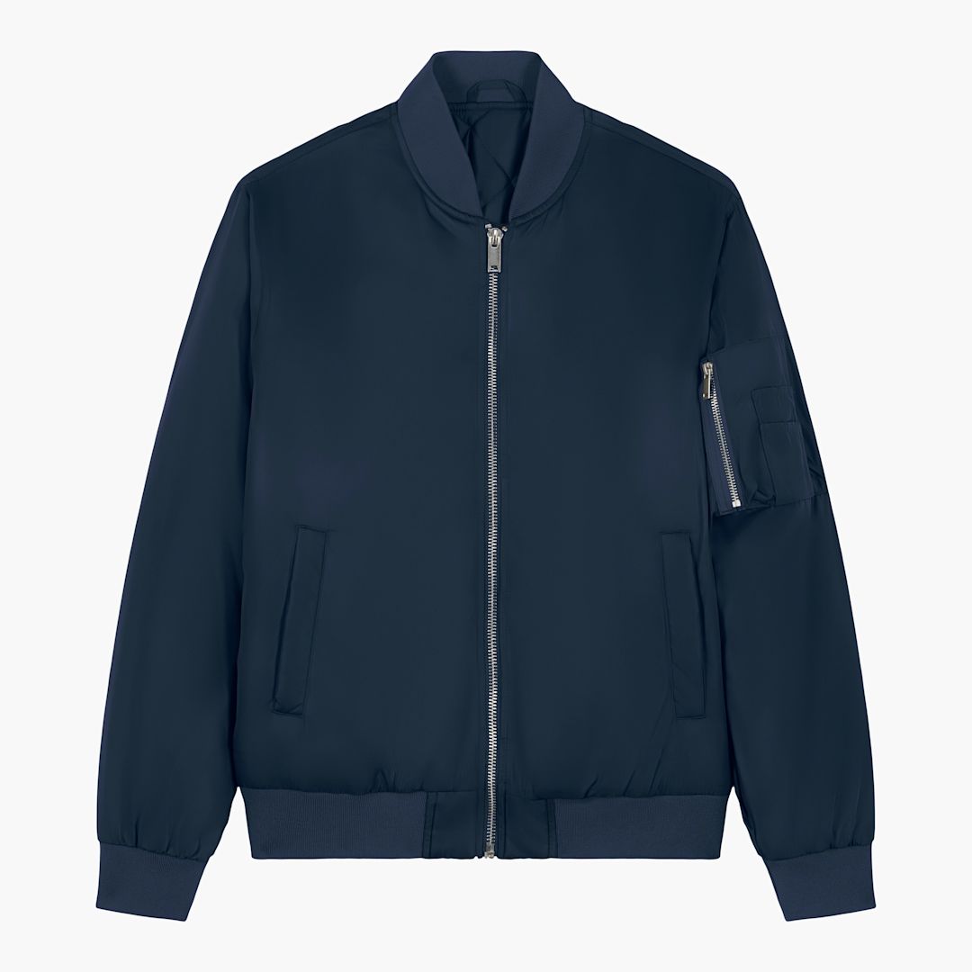 100% recycled polyester. unisex fit. Silver metal zip at center front. Inside fully quilted.