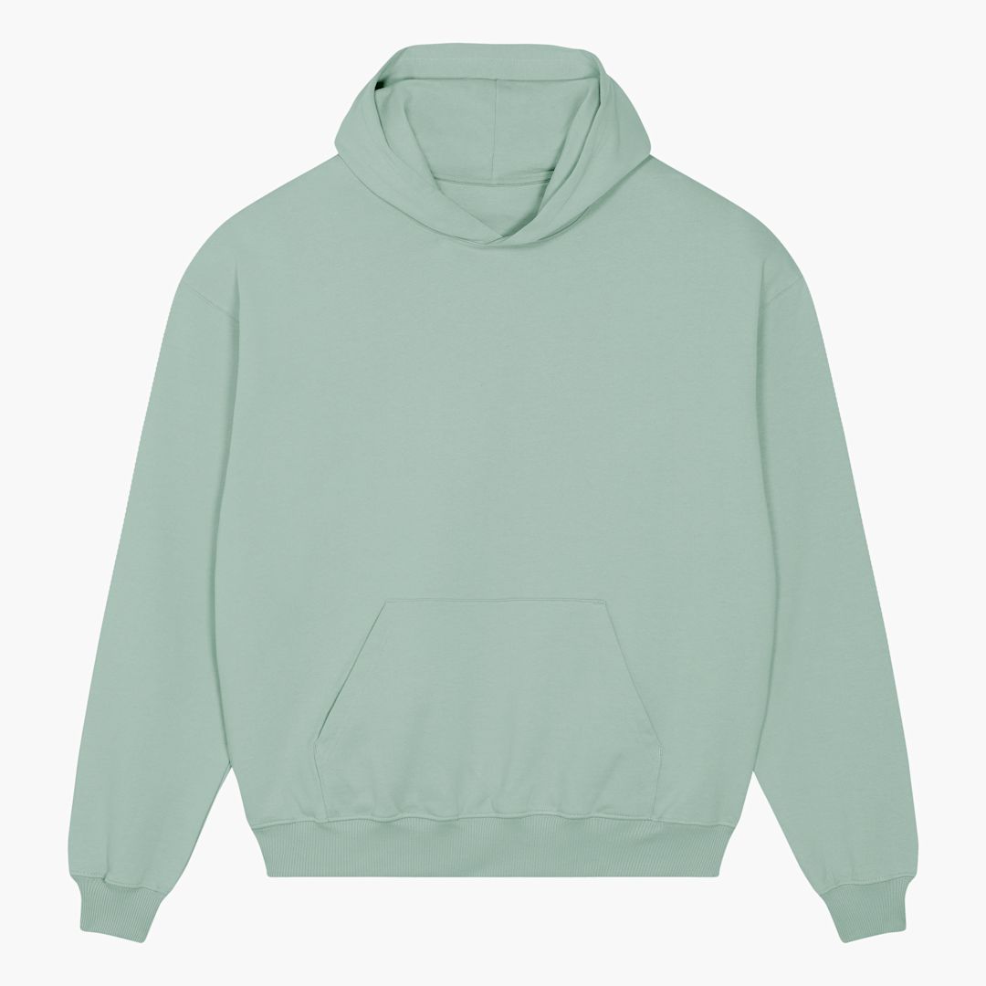 unisex boxy dry hand feel hoodie sweatshirt. 400gsm. 100% Organic French Terry Cotton. Set-in sleeve. Double layered hood. Single needle topstitch at neckline and along hood opening. 2x1 rib at sleeve hem and bottom hem. Kangaroo pocket at front.