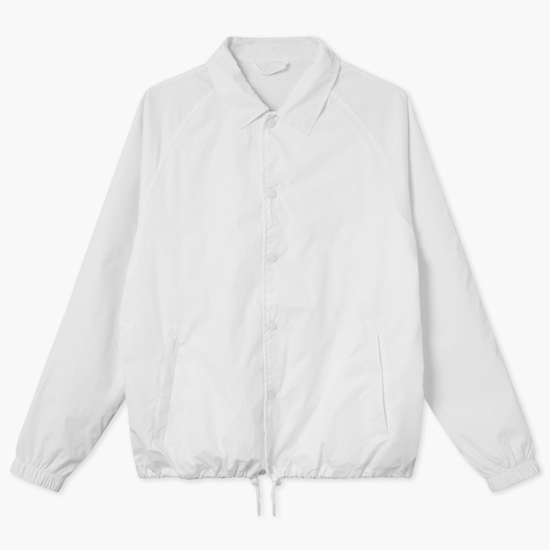 Raglan sleeve coach jacket with button closure. Outer 100% Nylon, Inner 100% Cotton, Lining 100% Polyester.