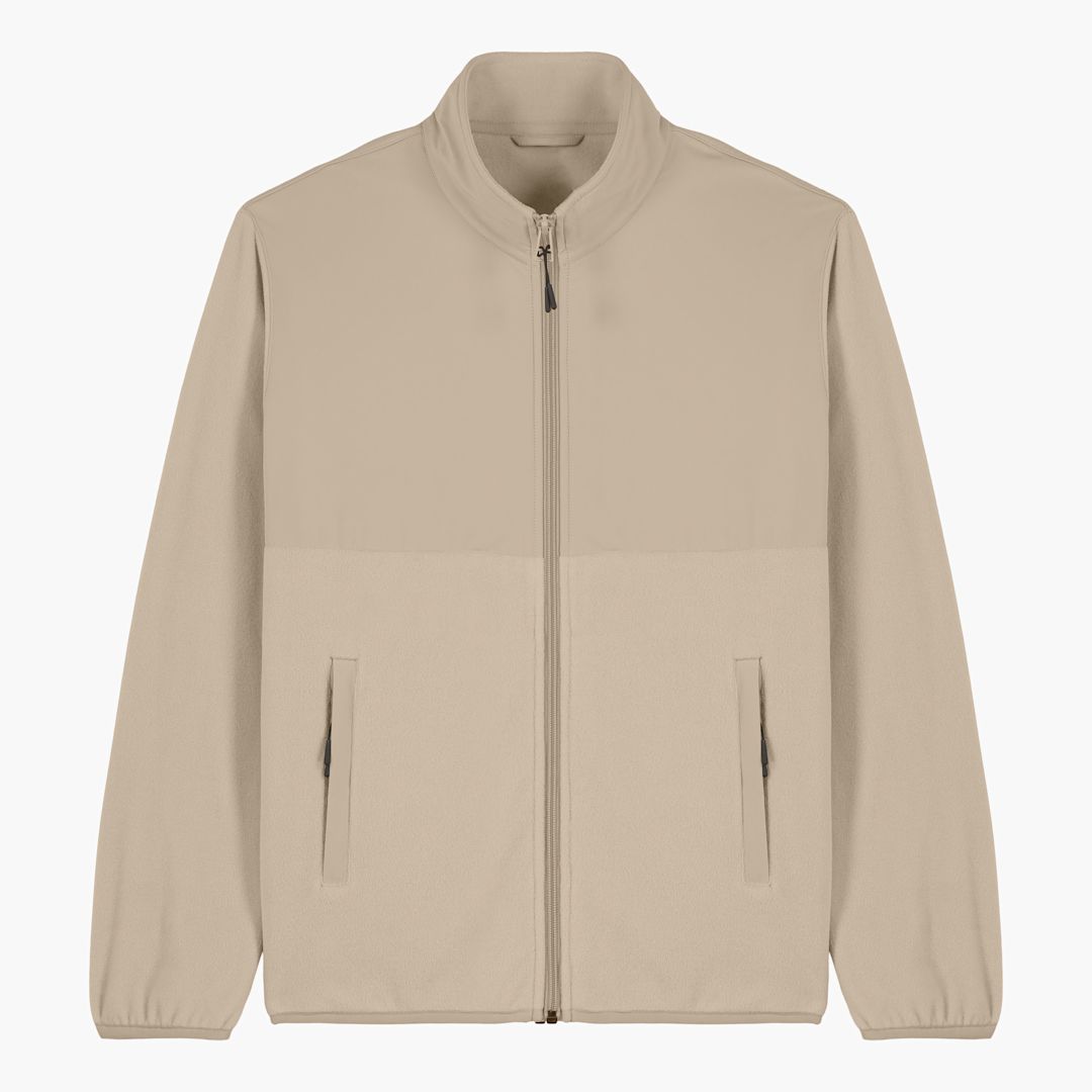 unisex fleece jacket. Polar Fleece, 100% recycled brushed Polyester. 300gsm. Elastic binding at cuffs and hem. Brushed Polar fleece fabric with Anti piling finish on inside and outside. Front side welt pockets with hidden zip closure. Contrast softshell fabric at Yoke and outer collar.