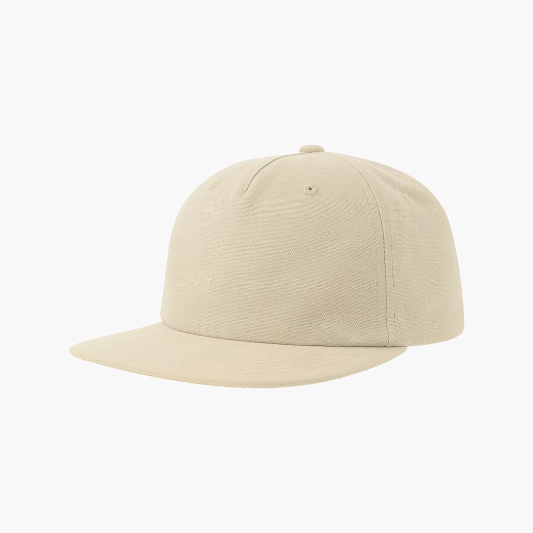 Unstructured 5-panel cap made of a blend of recycled (20%) and organic( 80%) cotton canvas. It features a flat visor and a recycled snapback closure.