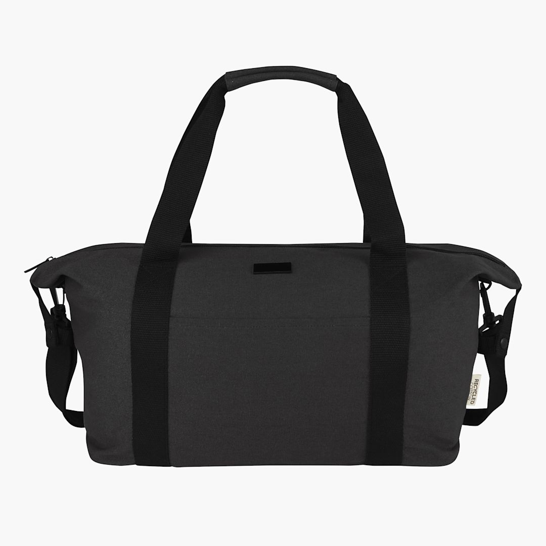sports duffel bag. 80% GRS-certified recycled cotton and 20% Cotton, 330gsm. features a spacious zipped main compartment with an internal zipped pocket for storage. It also has an open front pocket and another zip pocket and strap on the back for a roll bag. It can be carried comfortably with either reinforced fabric handles or with the removable and adjustable shoulder strap.