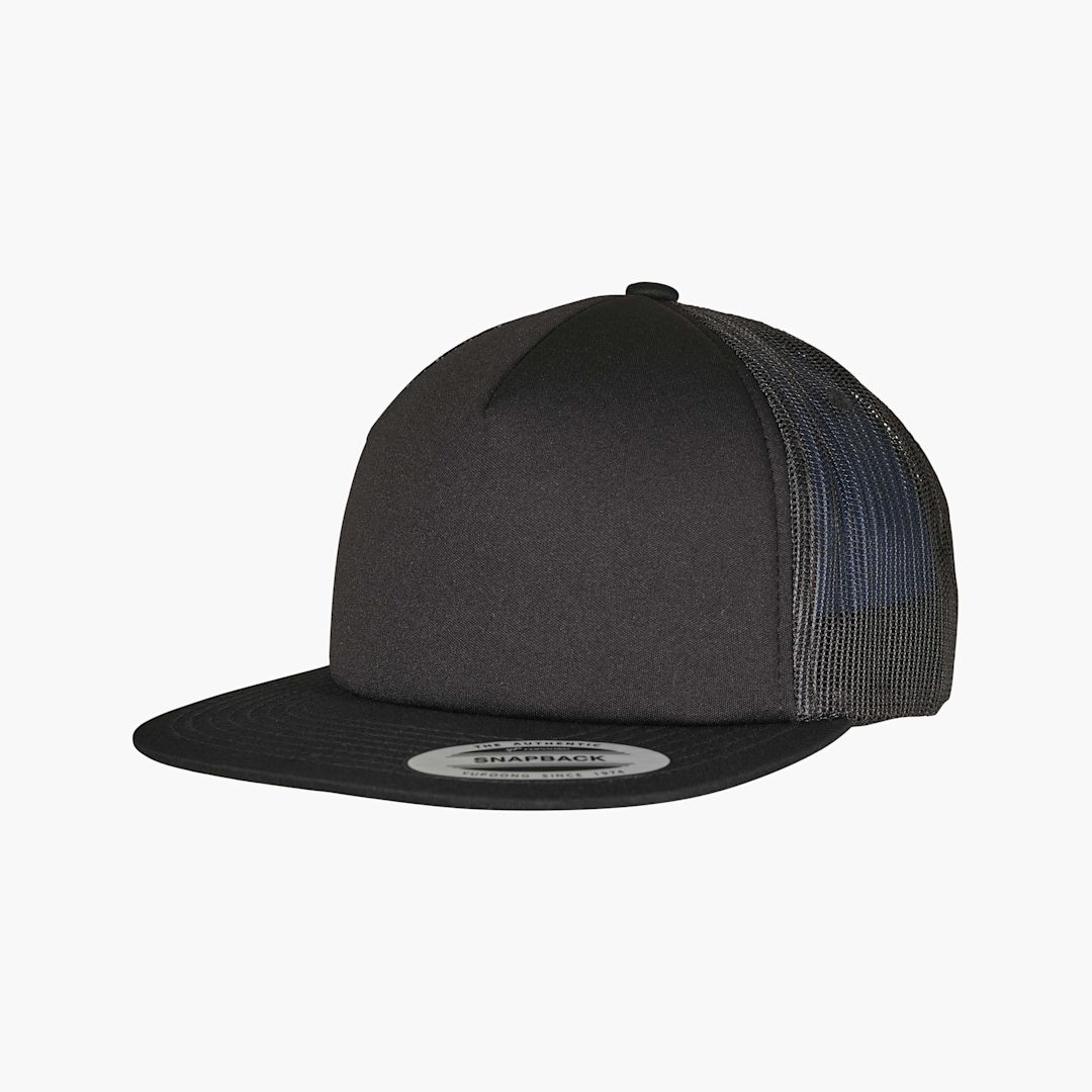 5 panels foam trucker cap with flat peak. Solid color, matching underside, 6 mm thick foam-lined front panel and mesh back. Adjustable plastic snapback buckle in matching color.