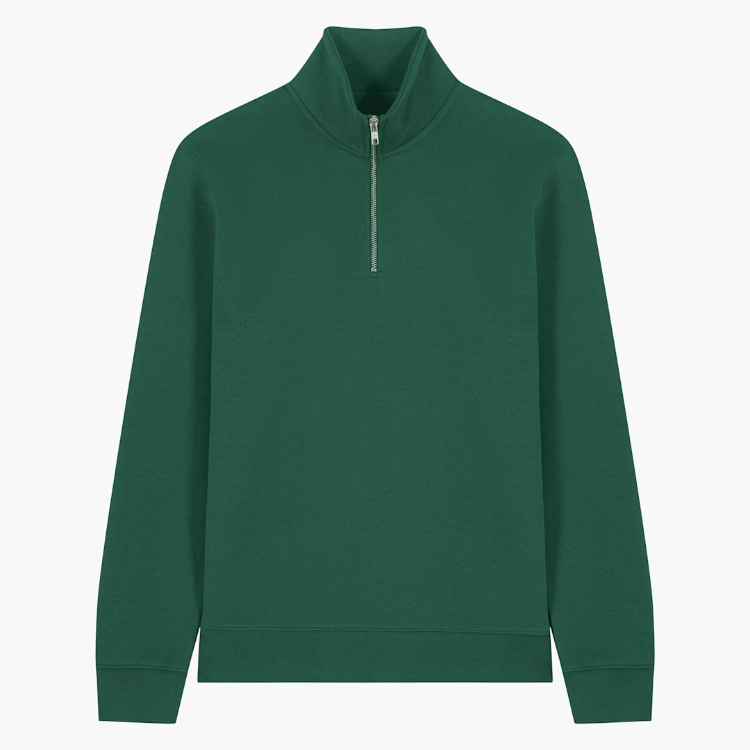 unisex quarter zip sweatshirt. Set-in sleeves. Self fabric mock neck collar. Quarter zip at center front. 280 GSM. 85% brushed Ring Spun Combed organic 15% recycled Polyester.