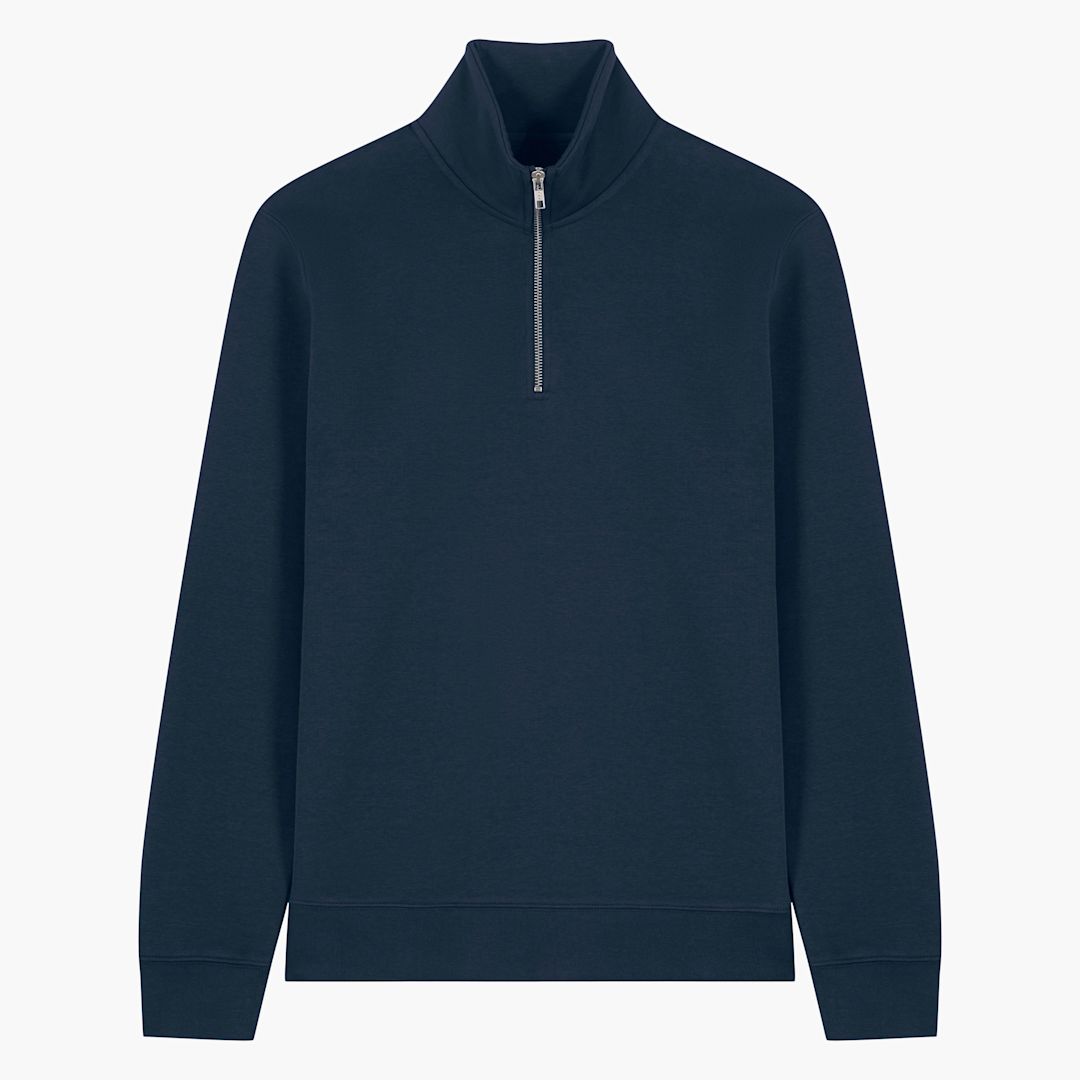 unisex quarter zip sweatshirt. Set-in sleeves. Self fabric mock neck collar. Quarter zip at center front. 280 GSM. 85% brushed Ring Spun Combed organic 15% recycled Polyester.