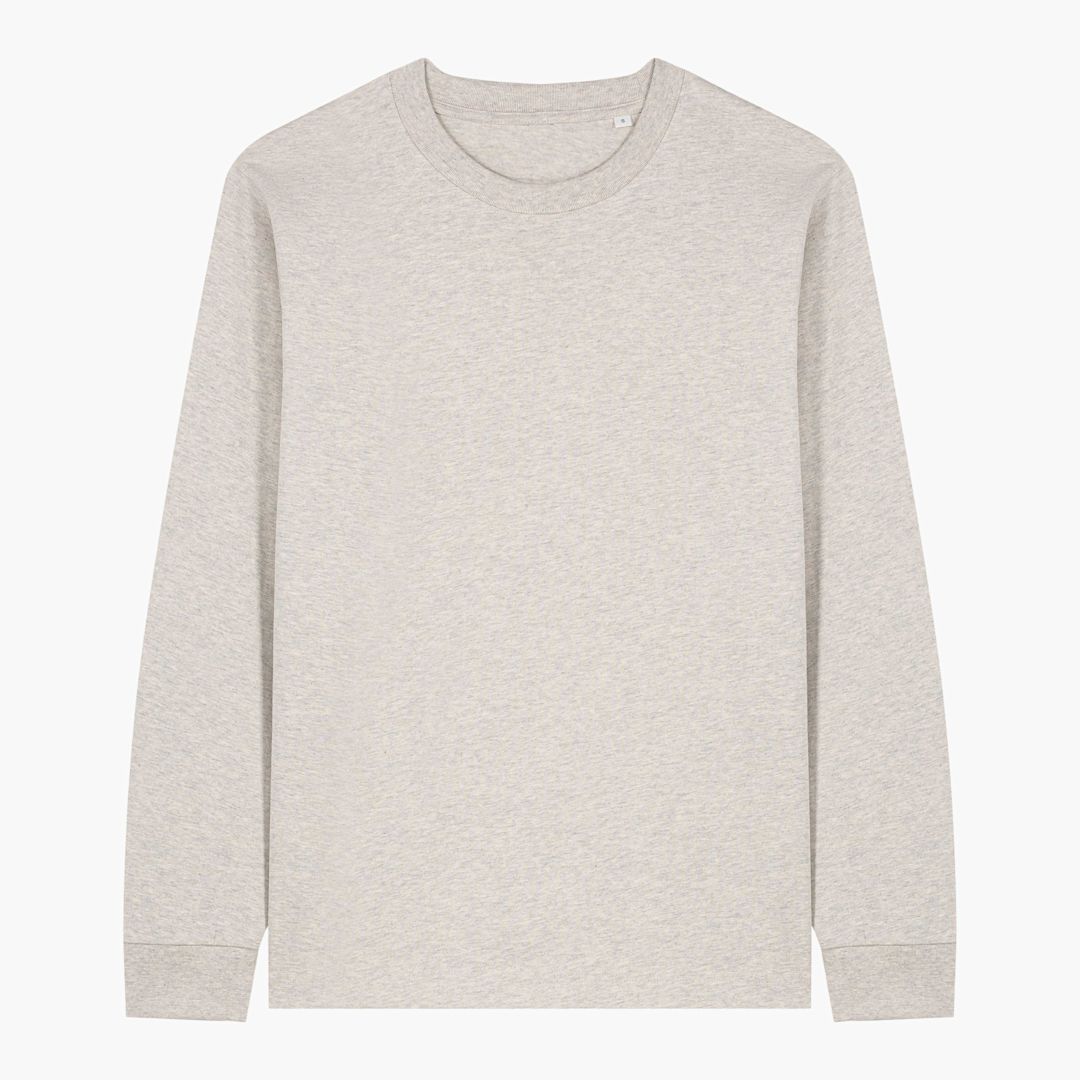 unisex heavy weigth long sleeve t-shirt. Relaxed fit. Double needles topstitches at sleeve cuffs and bottom hem. single jersey. 100% organic cotton. 240 GSM.