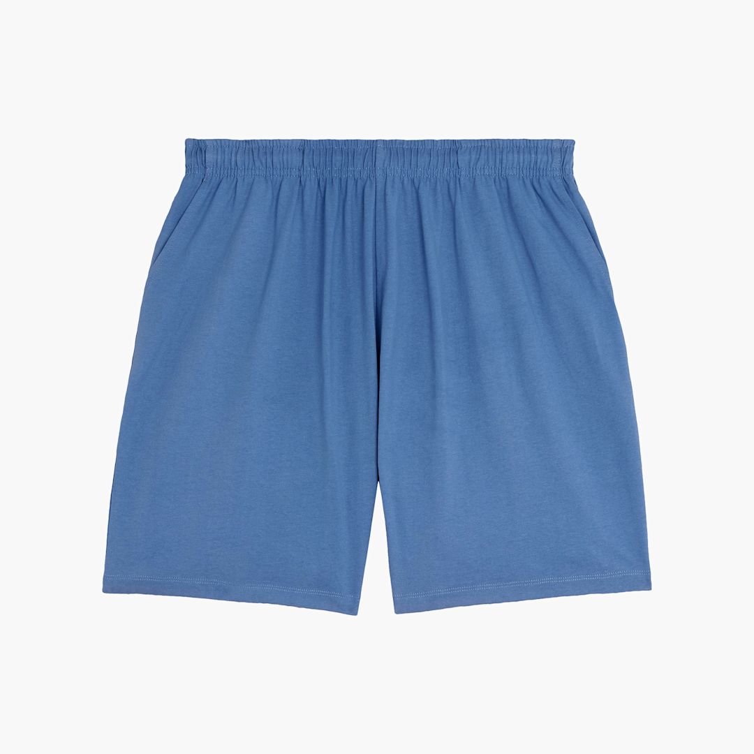 unisex single jersey shorts. 100% organic Single Jersey cotton. 240gsm. Self fabric elastic waistband. Hidden flat drawcords on inside waistband. Pockets at front. Patch pocket at back. Bottom hem with narrow double needle topstitch.