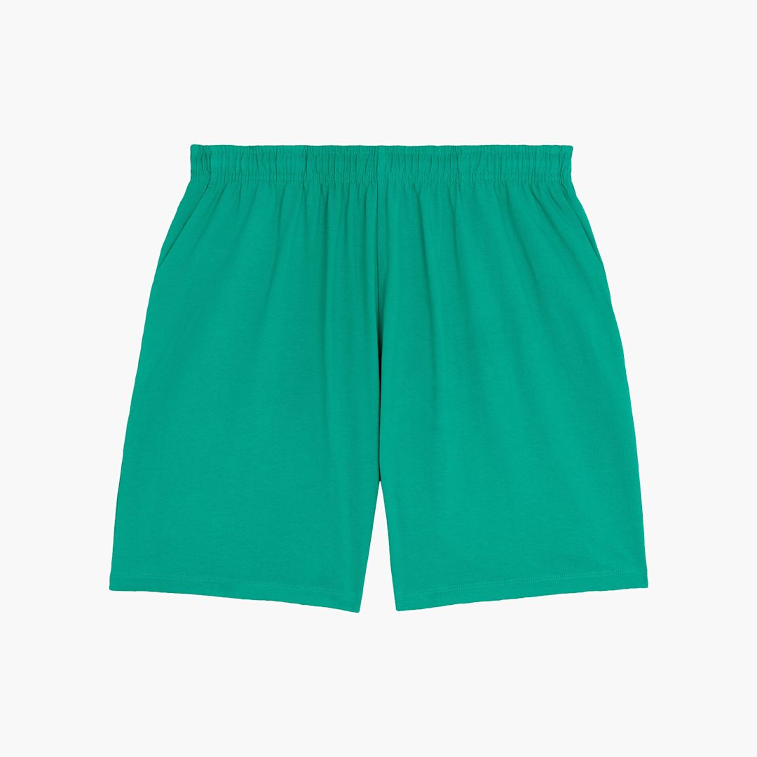 unisex single jersey shorts. 100% organic Single Jersey cotton. 240gsm. Self fabric elastic waistband. Hidden flat drawcords on inside waistband. Pockets at front. Patch pocket at back. Bottom hem with narrow double needle topstitch.