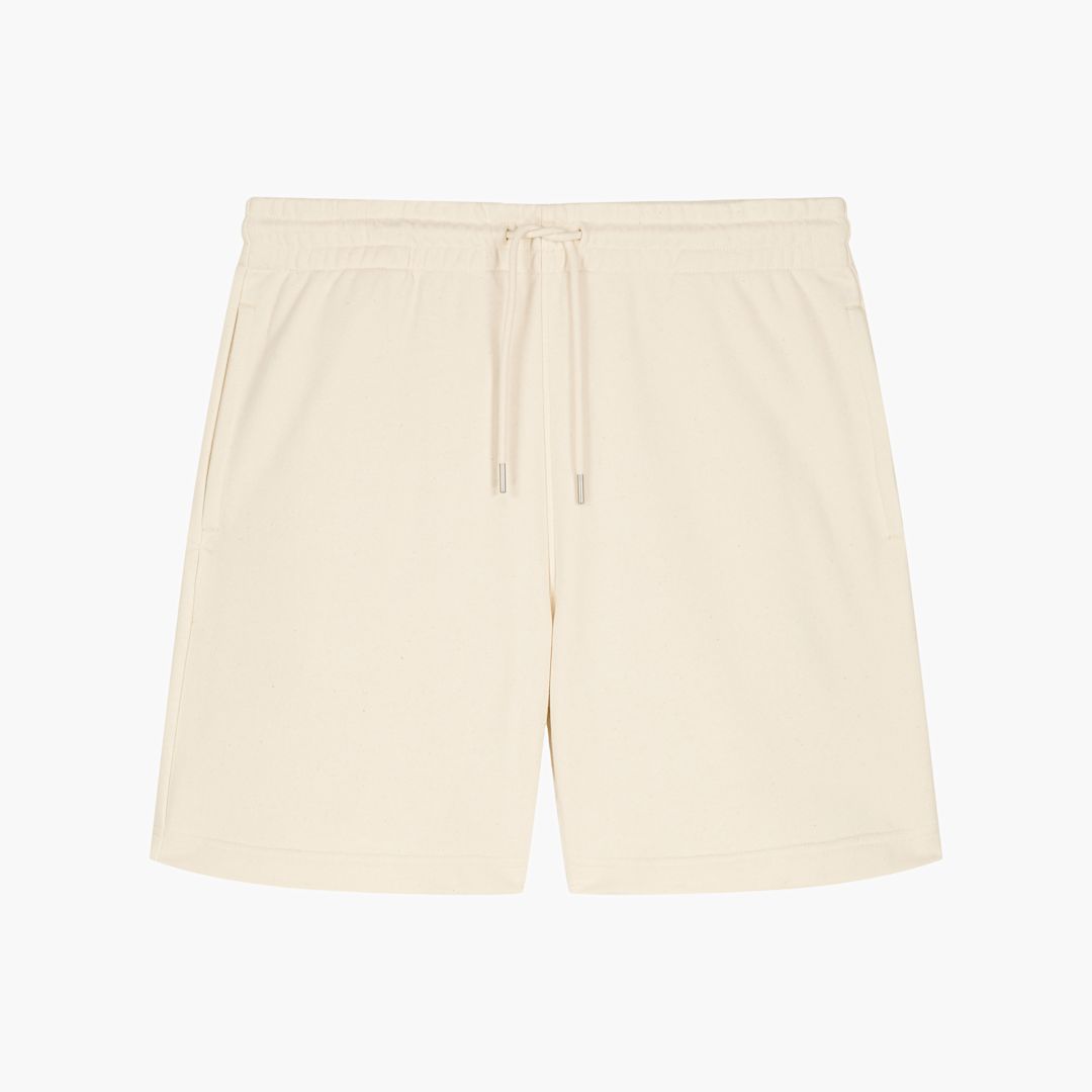 mid-light unisex jogger shorts. medium fit. 300gsm. 85% organic French Terry cotton + 15% recycled polyester. Self fabric elasticated grown on waistband. Round drawcords in matching body colour. Inserted side seam pockets. Twin needle stitch at leg openin.