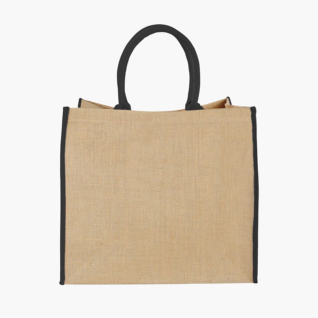 jute tote with contrast color edges 25l. OEKO-Tex certified. Load capacity up to 12 kg. can be screenprinted with one color logo on.
