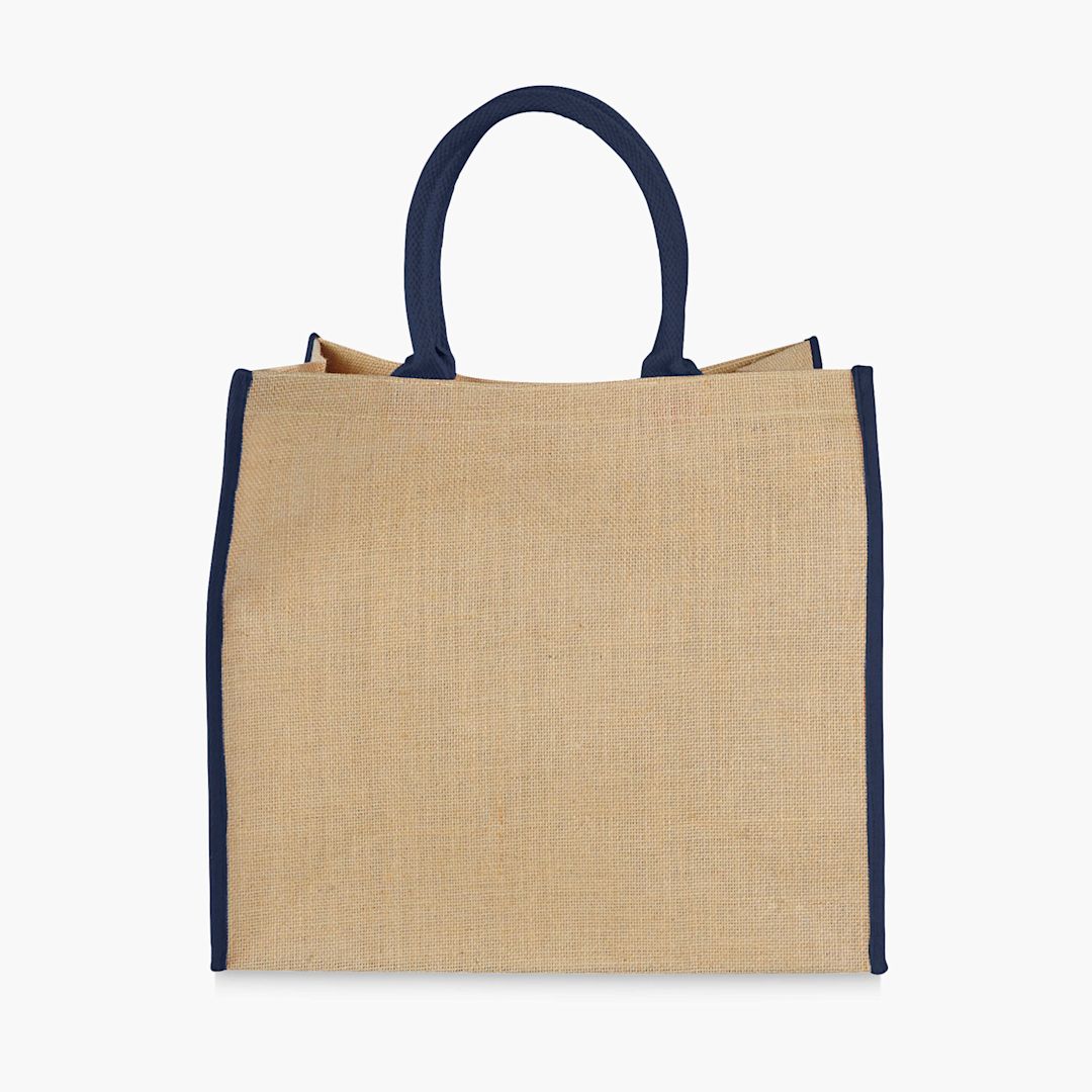 jute tote with contrast color edges 25l. OEKO-Tex certified. Load capacity up to 12 kg. can be screenprinted with one color logo on.