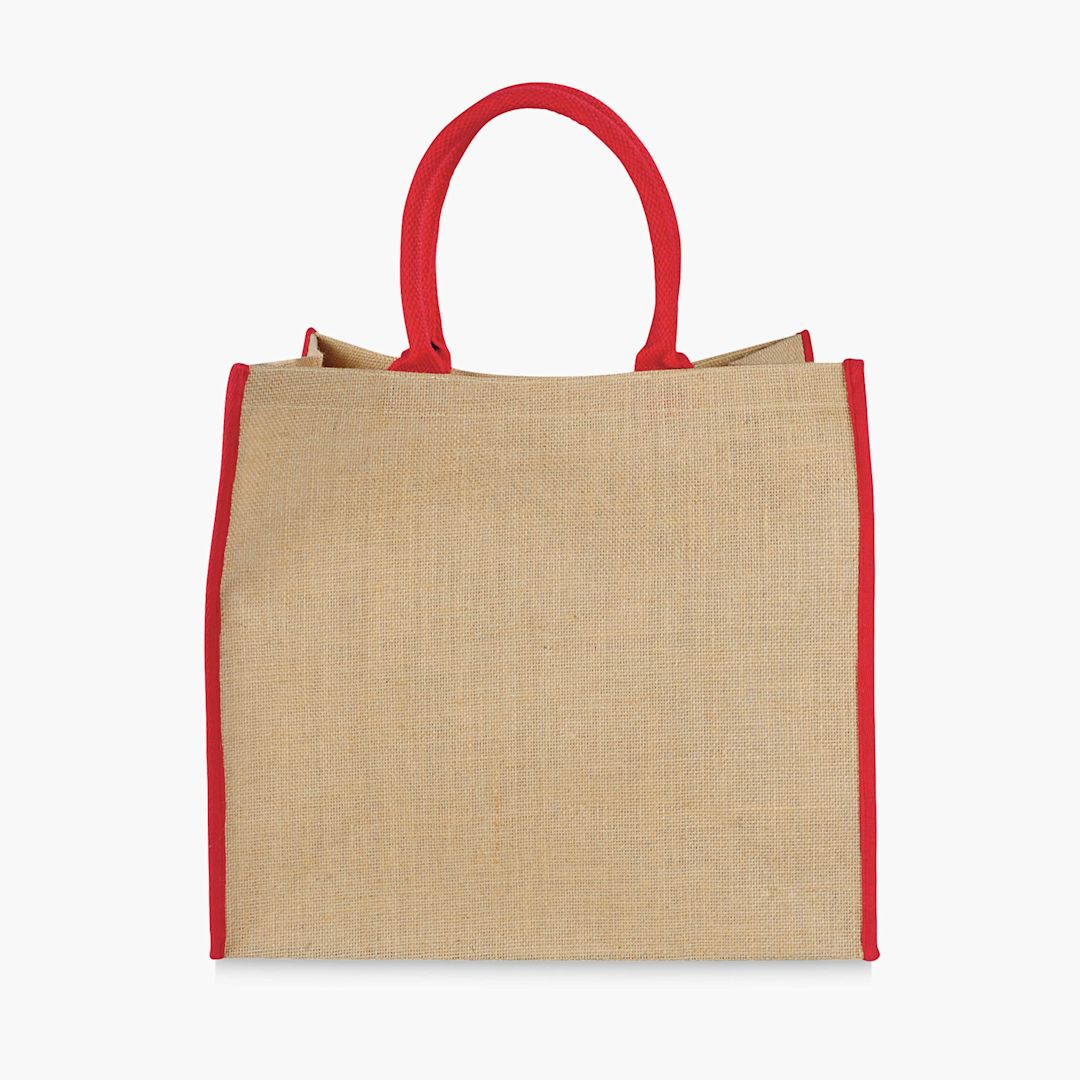 jute tote with contrast color edges 25l. OEKO-Tex certified. Load capacity up to 12 kg. can be screenprinted with one color logo on.