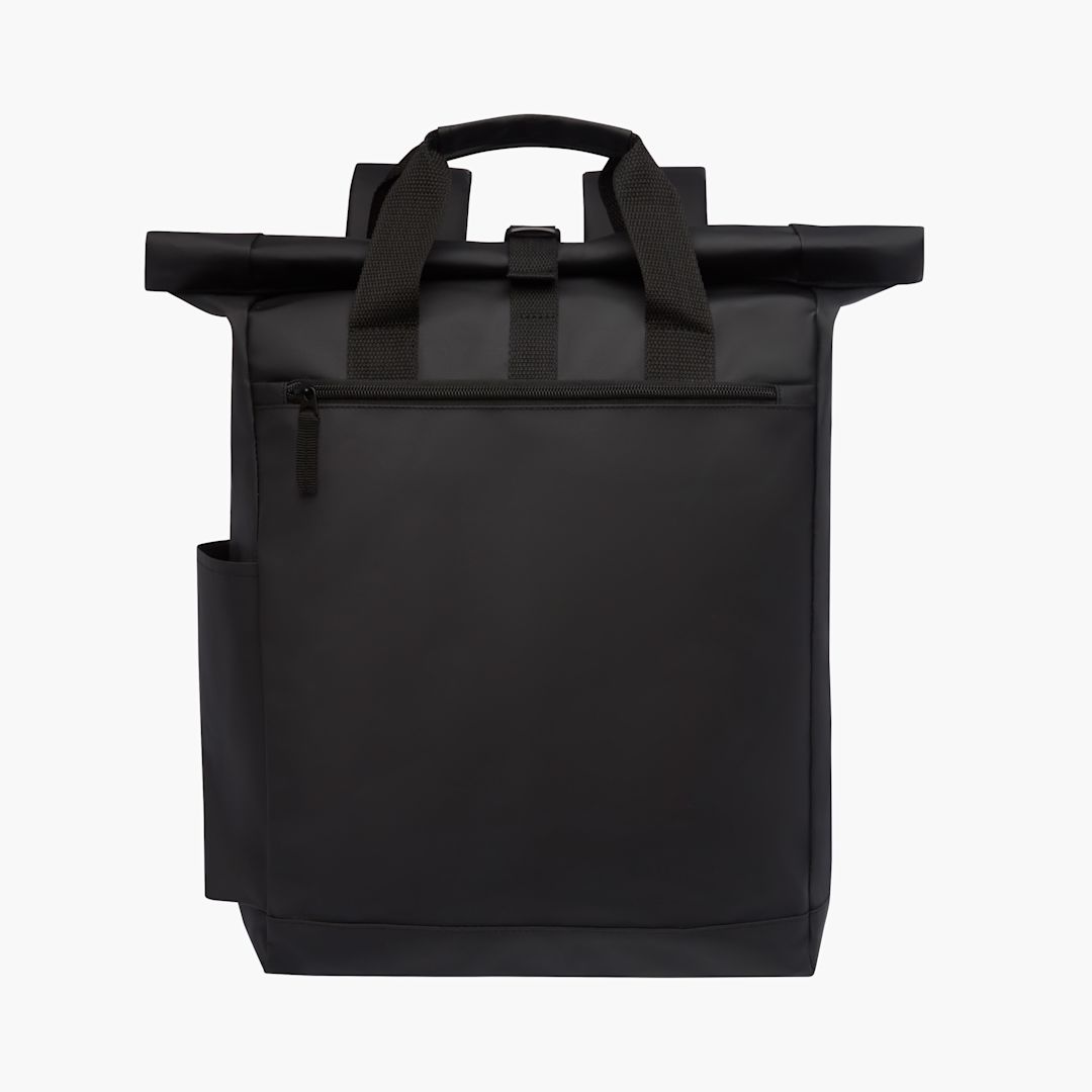Water-resistant backpack with padded laptop compartment, padded adjustable shoulder straps, main compartment with zip and roll closure and 2 carrying handles. 23L.