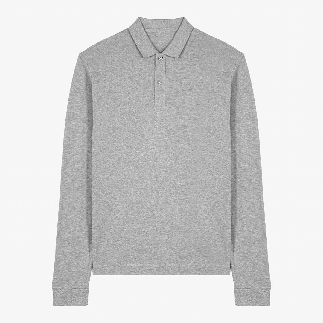 unisex polo long sleeve. Medium fit. Flat knit rib on collar. Front placket with 2 buttons in matching body colour. 100% Organic Ring Spun Combed Cotton. 240 GSM.