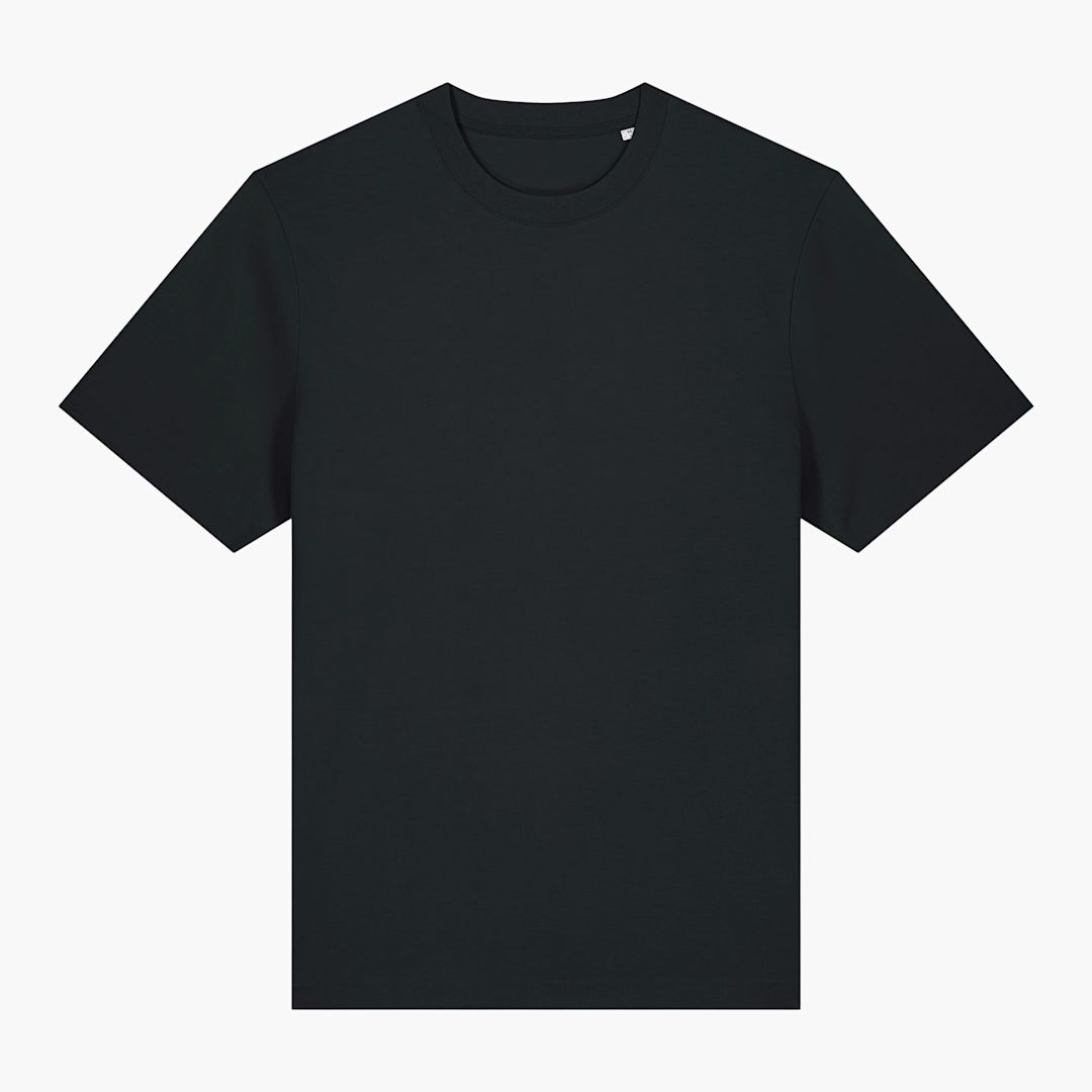 unisex relaxed t-shirt. medium weight 215gsm. 100% organic cotton. 1x1 rib at neck collar. Inside back neck tape in self fabric. Twin needle topstitch at sleeve cuff and hem.