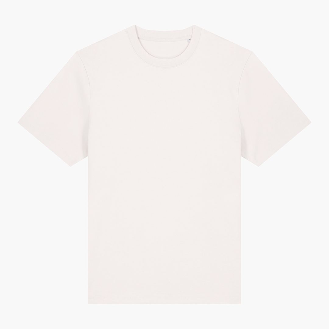 unisex relaxed t-shirt. medium weight 215gsm. 100% organic cotton. 1x1 rib at neck collar. Inside back neck tape in self fabric. Twin needle topstitch at sleeve cuff and hem.