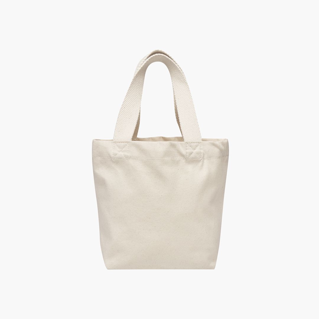 mini tote bag. 100% organic cotton canvas. 340gsm. Cotton fabric handle. Handle length: 34 cm.