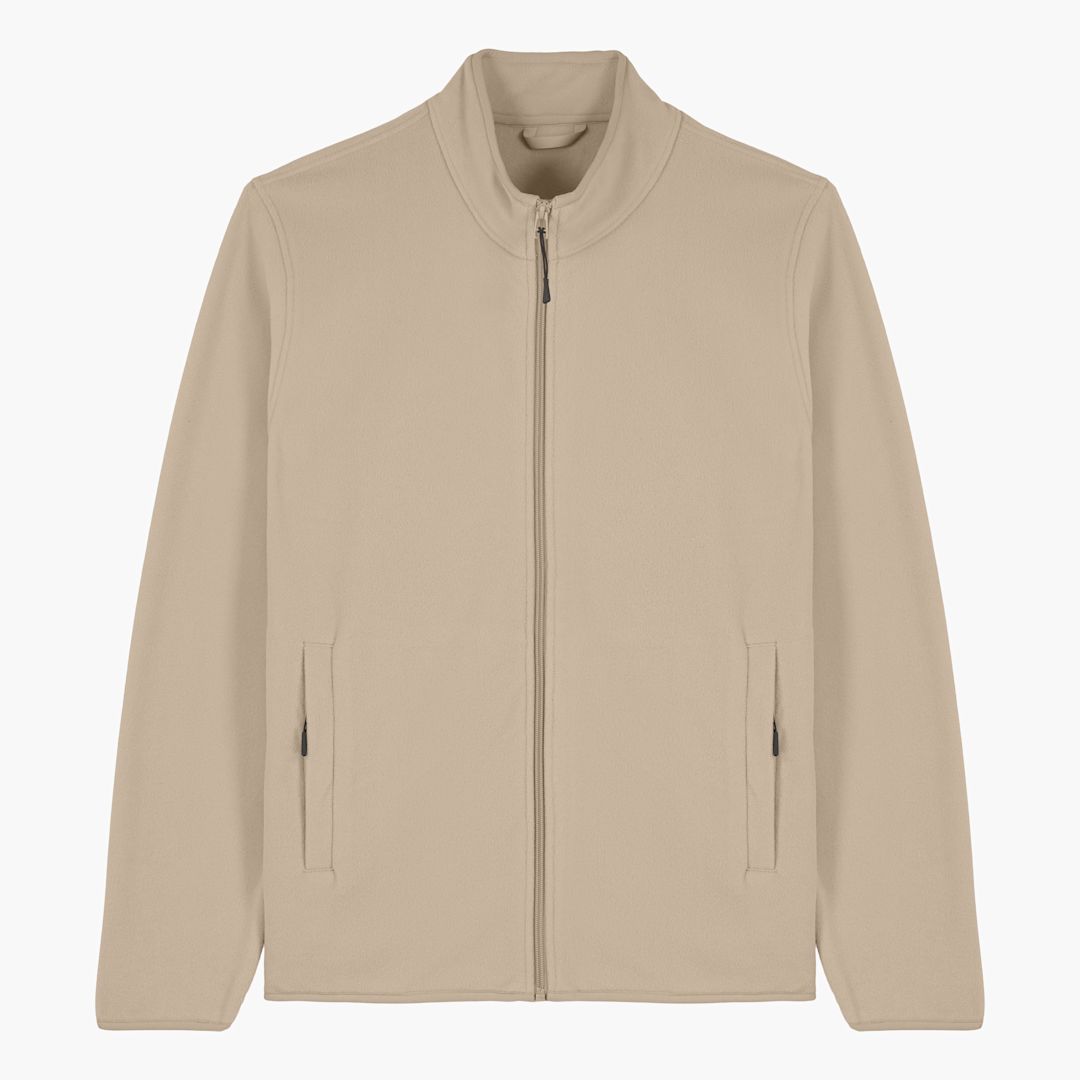 men's fleece jacket. medium fit. 300gsm. Polar Fleece, 100% recycled Polyester. Brushed fabric with Anti piling finish on inside and outside. Elastic binding at neck edge, cuffs and hem. Front side welt pockets with zip opening.