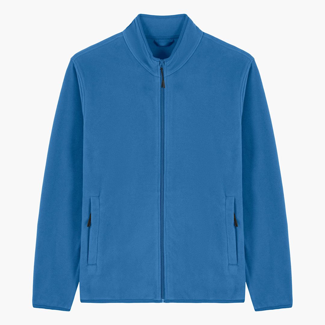 men's fleece jacket. medium fit. 300gsm. Polar Fleece, 100% recycled Polyester. Brushed fabric with Anti piling finish on inside and outside. Elastic binding at neck edge, cuffs and hem. Front side welt pockets with zip opening.