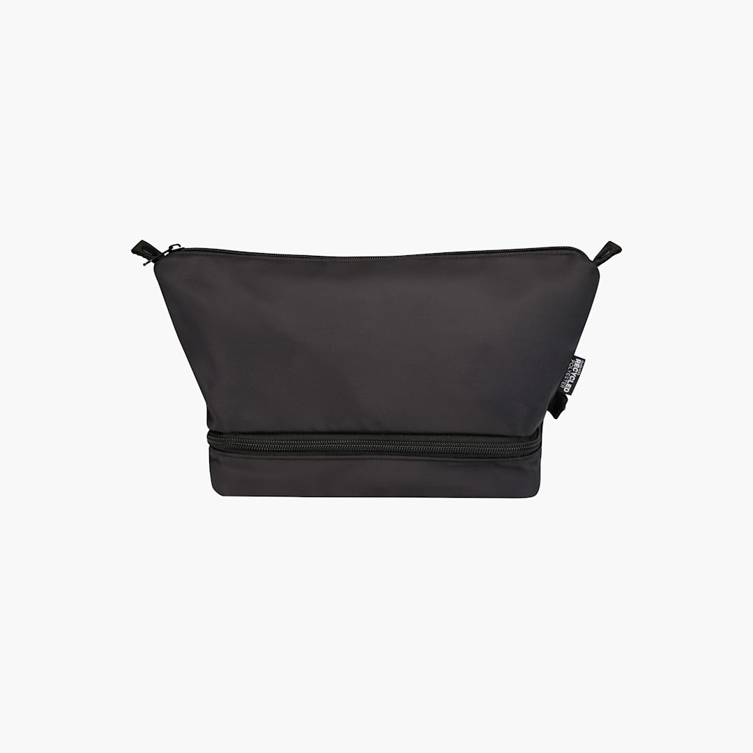 Recycled Toiletry Bag. Made from 290D recycled twill polyester with a knit back and lined with RPET 210D/PU. The main compartment has an internal zippered pocket for smaller items, while the bottom compartment with a clamshell opening keeps essentials separate for easier access and improved organization. Volume capacity: 6 liters.