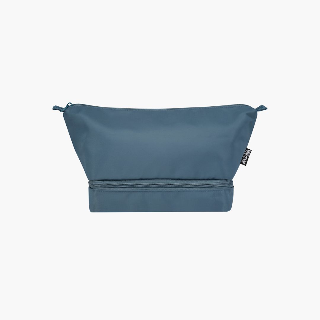 Recycled Toiletry Bag. Made from 290D recycled twill polyester with a knit back and lined with RPET 210D/PU. The main compartment has an internal zippered pocket for smaller items, while the bottom compartment with a clamshell opening keeps essentials separate for easier access and improved organization. Volume capacity: 6 liters.
