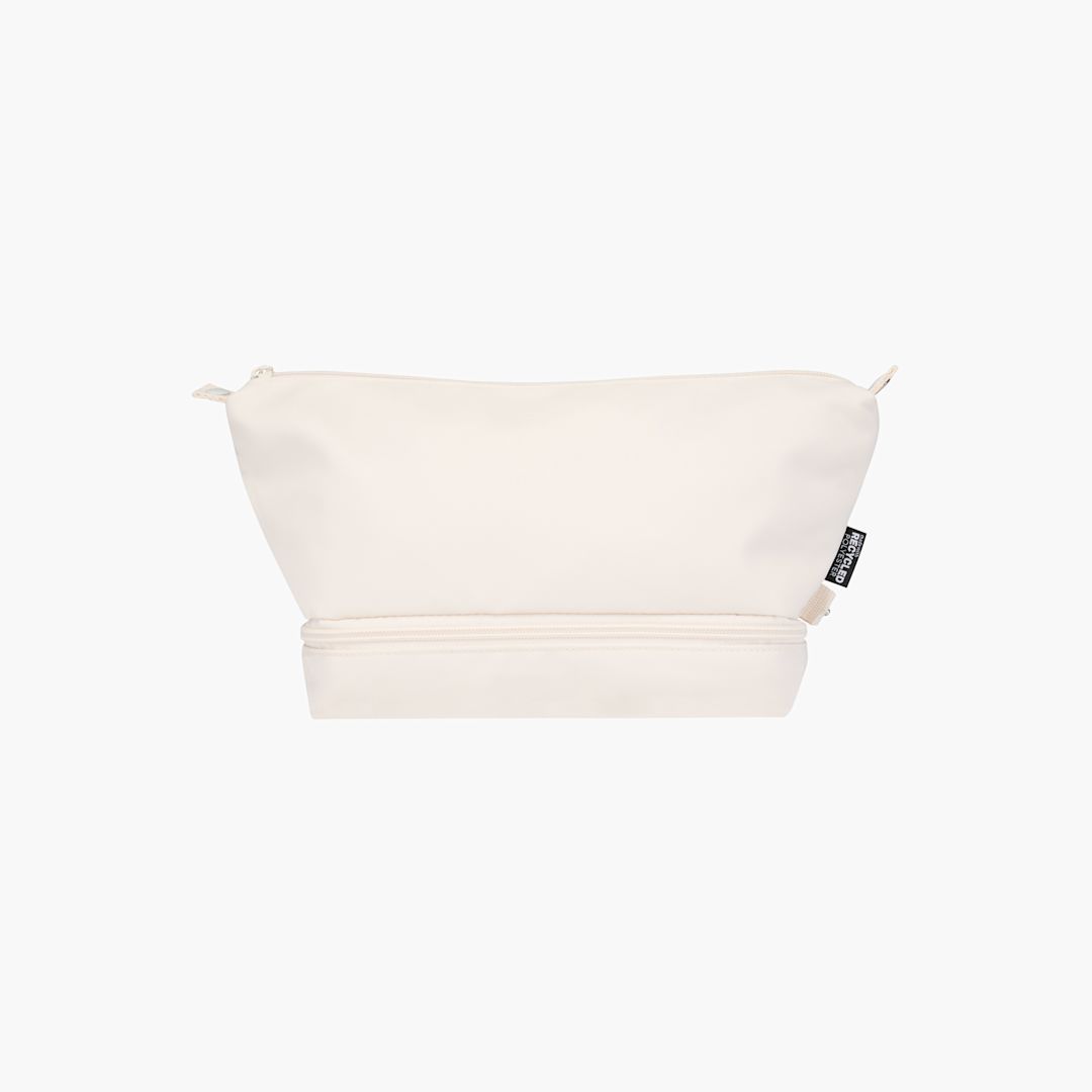 Recycled Toiletry Bag. Made from 290D recycled twill polyester with a knit back and lined with RPET 210D/PU. The main compartment has an internal zippered pocket for smaller items, while the bottom compartment with a clamshell opening keeps essentials separate for easier access and improved organization. Volume capacity: 6 liters.