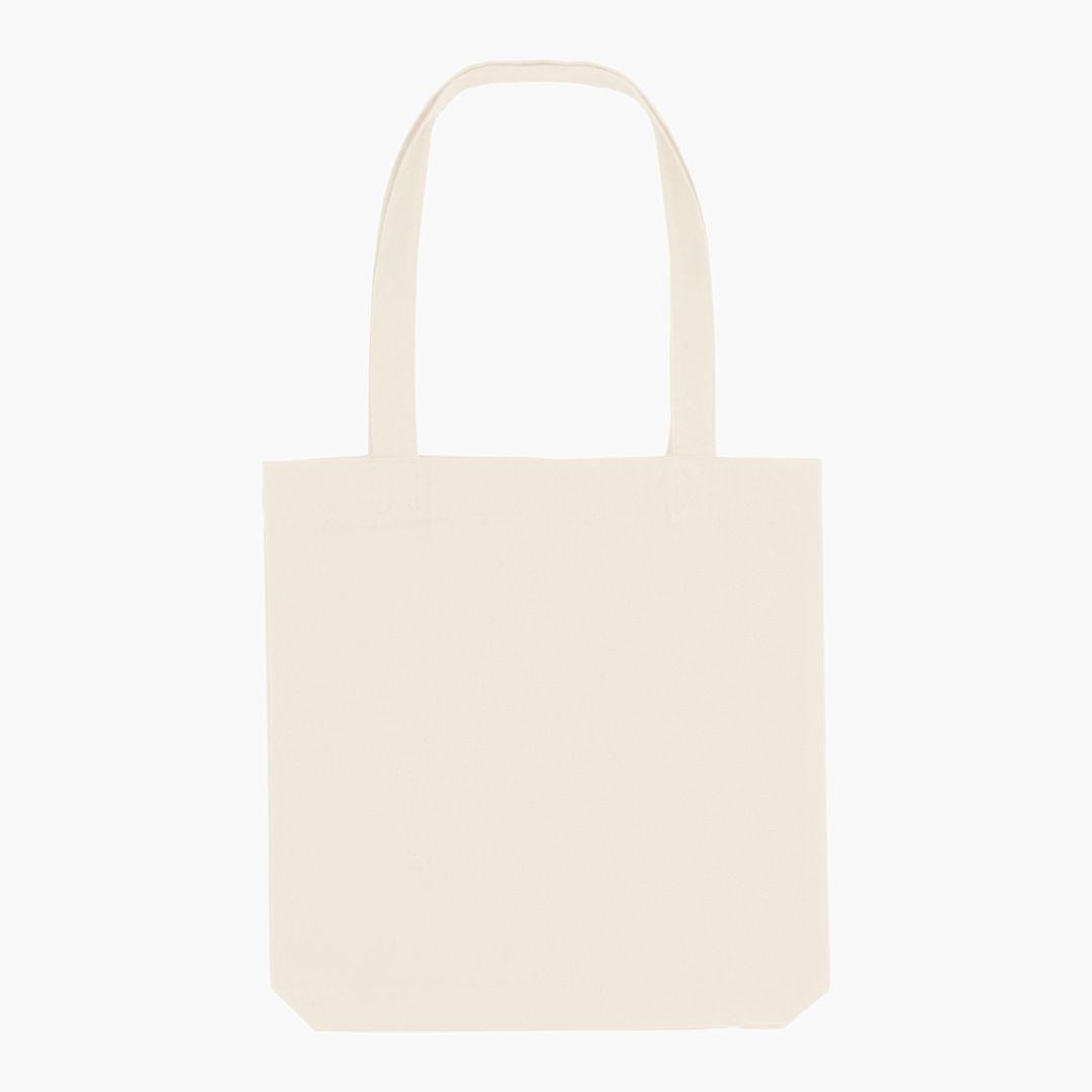 Woven tote bag. 80% recycled Cotton + 20% recycled Polyester. 300gsm. Long handles with reinforced cross stitch. Shaping seam at bottom to create volume. handle length 65cm