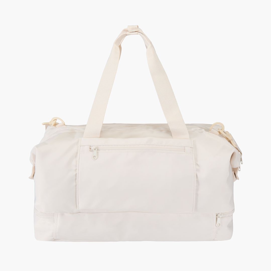 Recycled Travel Duffel. Made from a durable recycled 290D twill polyester with a soft knit back and lined with RPET 210D/PU. The main compartment has a large zip pocket, two internal pockets and double water bottle holders. A separate bottom compartment with a clamshell opening. side pocket can be . Volume capacity: 42 liters.