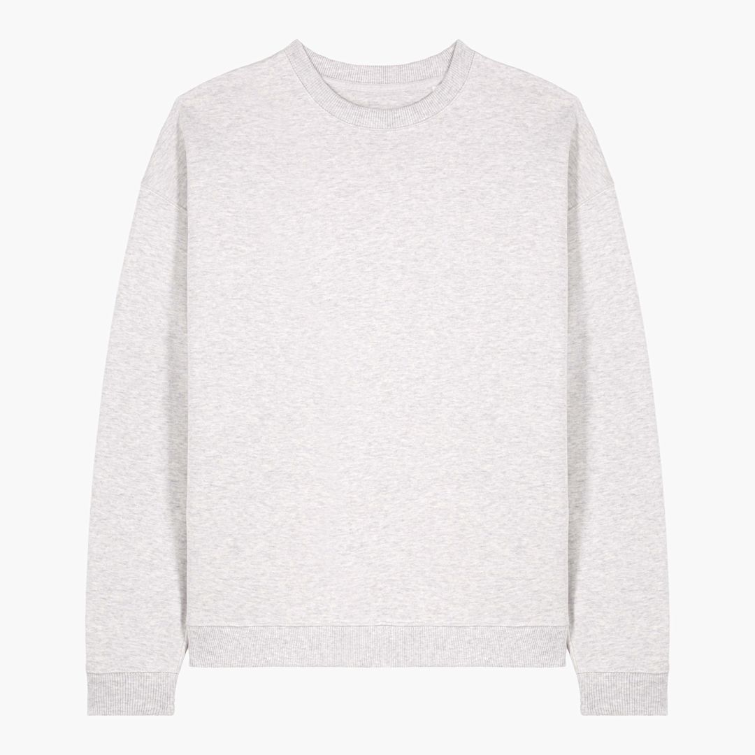 unisex oversized crew neck sweatshirt. 100% organic Ring Spun Combed cotton. 350gsm. 2x1 Rib at collar, sleeve cuffs and bottom hem. Double needles topstitches on all seams. Self fabric half moon at back neck.
