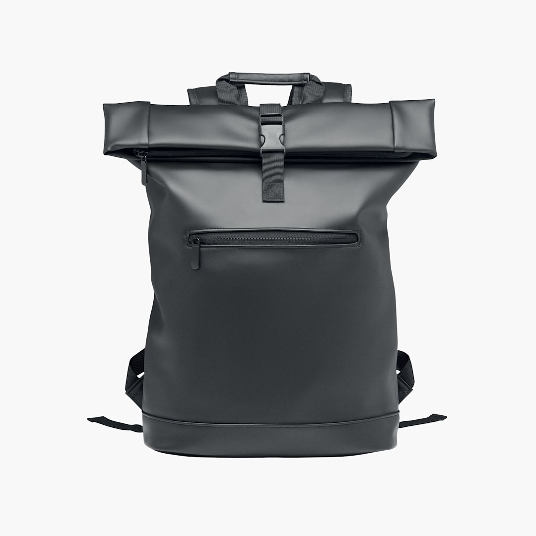 15" laptop backpack in soft PU with padded back and reinforced bottom. Large zippered pocket on the front. Lining is 210D RPET.