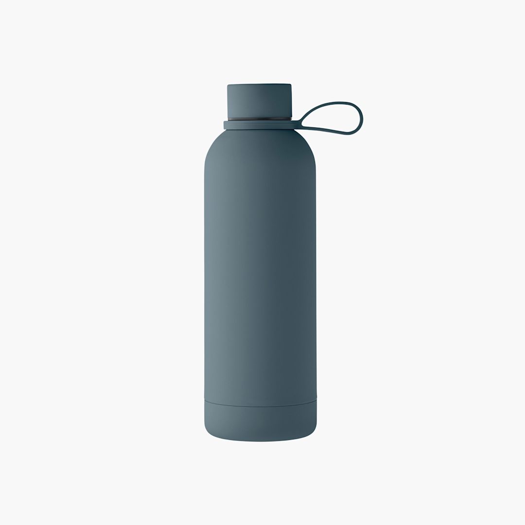 Double wall vacuum insulated bottle in recycled stainless steel (90% recycled stainless steel and 10% stainless steel) with rubber finish and silicone handle. Volume: 500 ml.