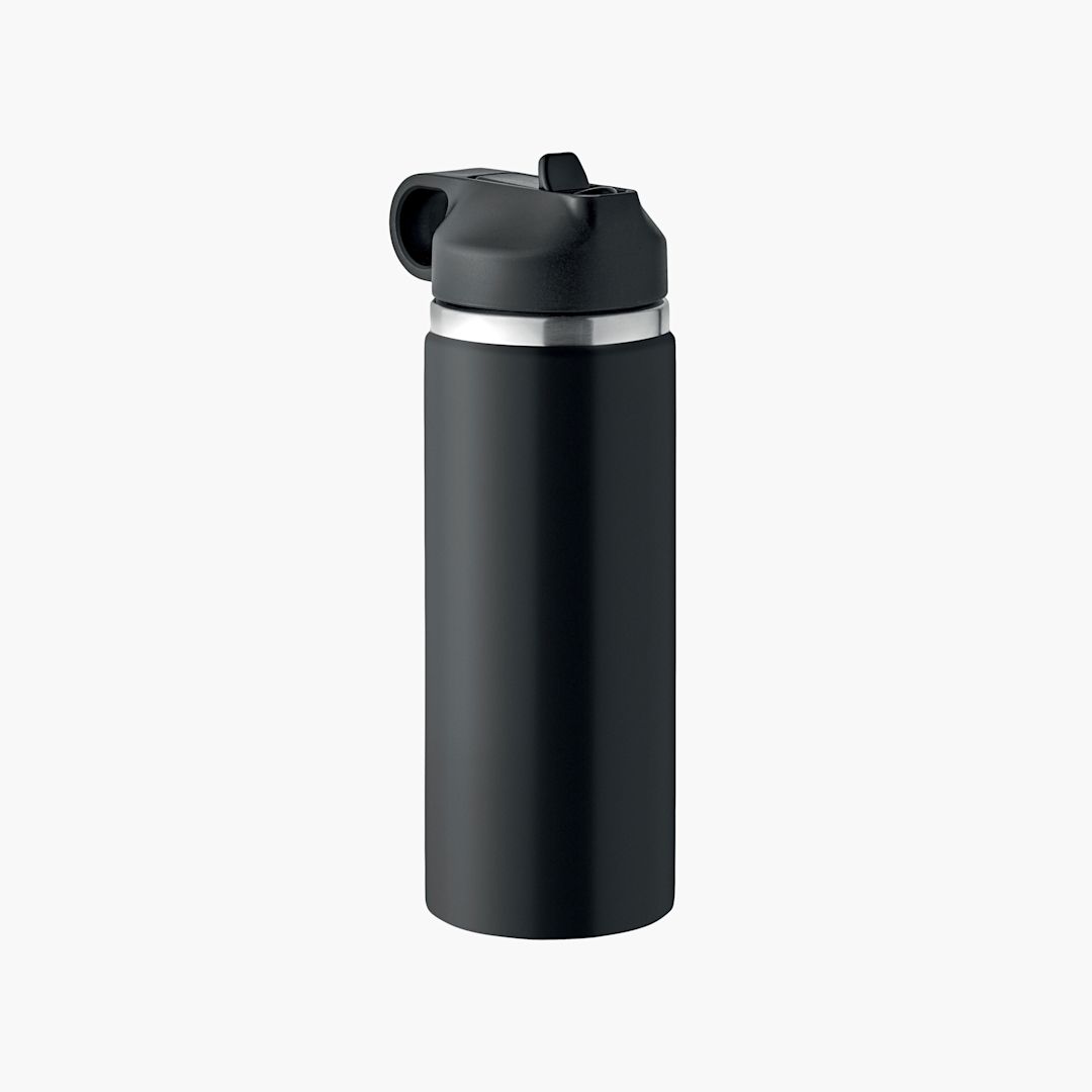 Recycled stainless steel double wall bottle. 90% recycled stainless and steel 10% stainless steel. insulated vacuum bottle with lid with PP grip handle and integrated straw built-in straw. Leak free. 500ml.