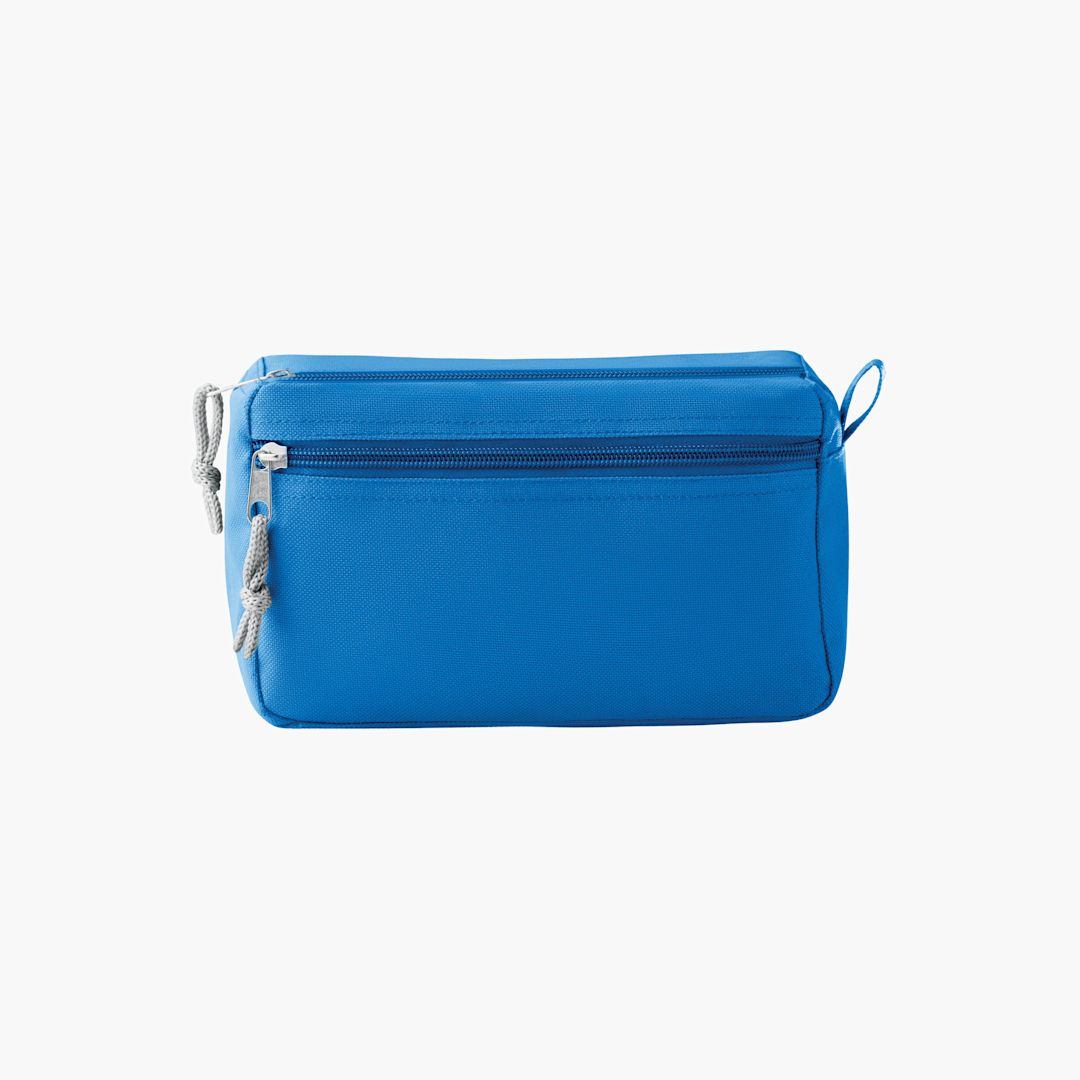 Toiletry bag with front pocket and hanger loop. 600D polyester with PPE backing.