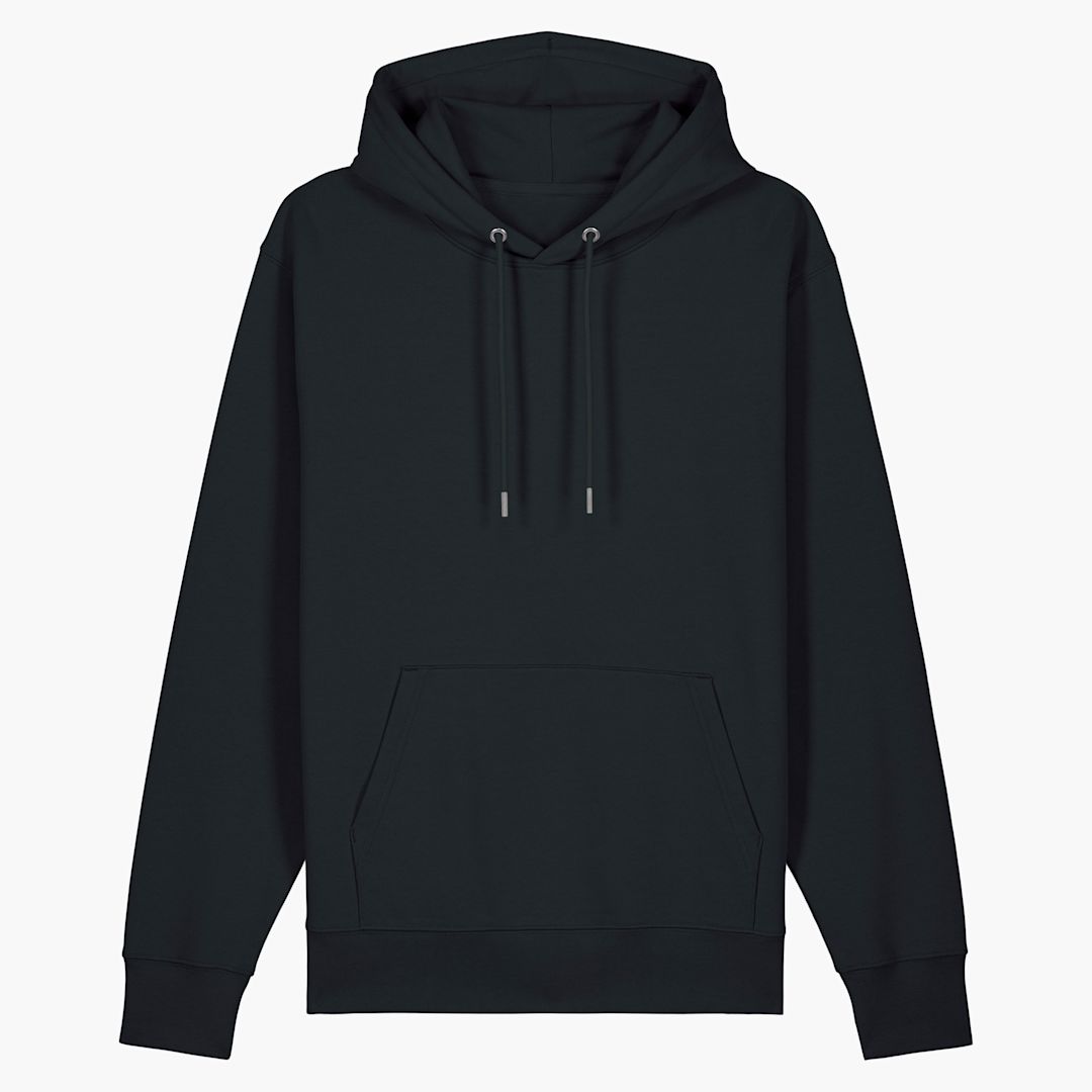 unisex hoodie sweatshirt. medium fit. 100% brushed organic Cotton. Double self fabric lined hood- Round drawcords in matching body colour. Closed end metal tipping and metal eyelets. Herringbone tape at insde back neck seam. Self fabric half moon at back neck.