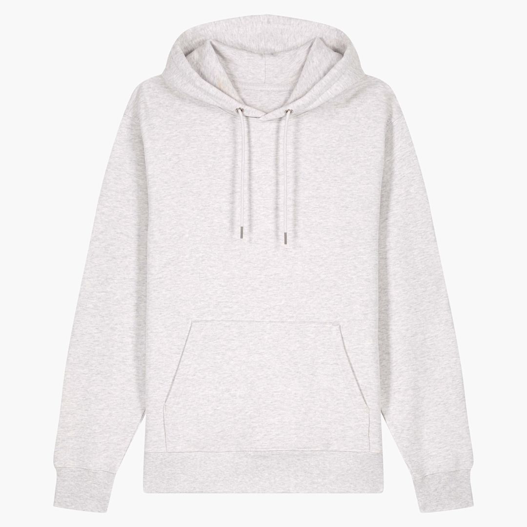 unisex hoodie sweatshirt. medium fit. 100% brushed organic Cotton. Double self fabric lined hood- Round drawcords in matching body colour. Closed end metal tipping and metal eyelets. Herringbone tape at insde back neck seam. Self fabric half moon at back neck.