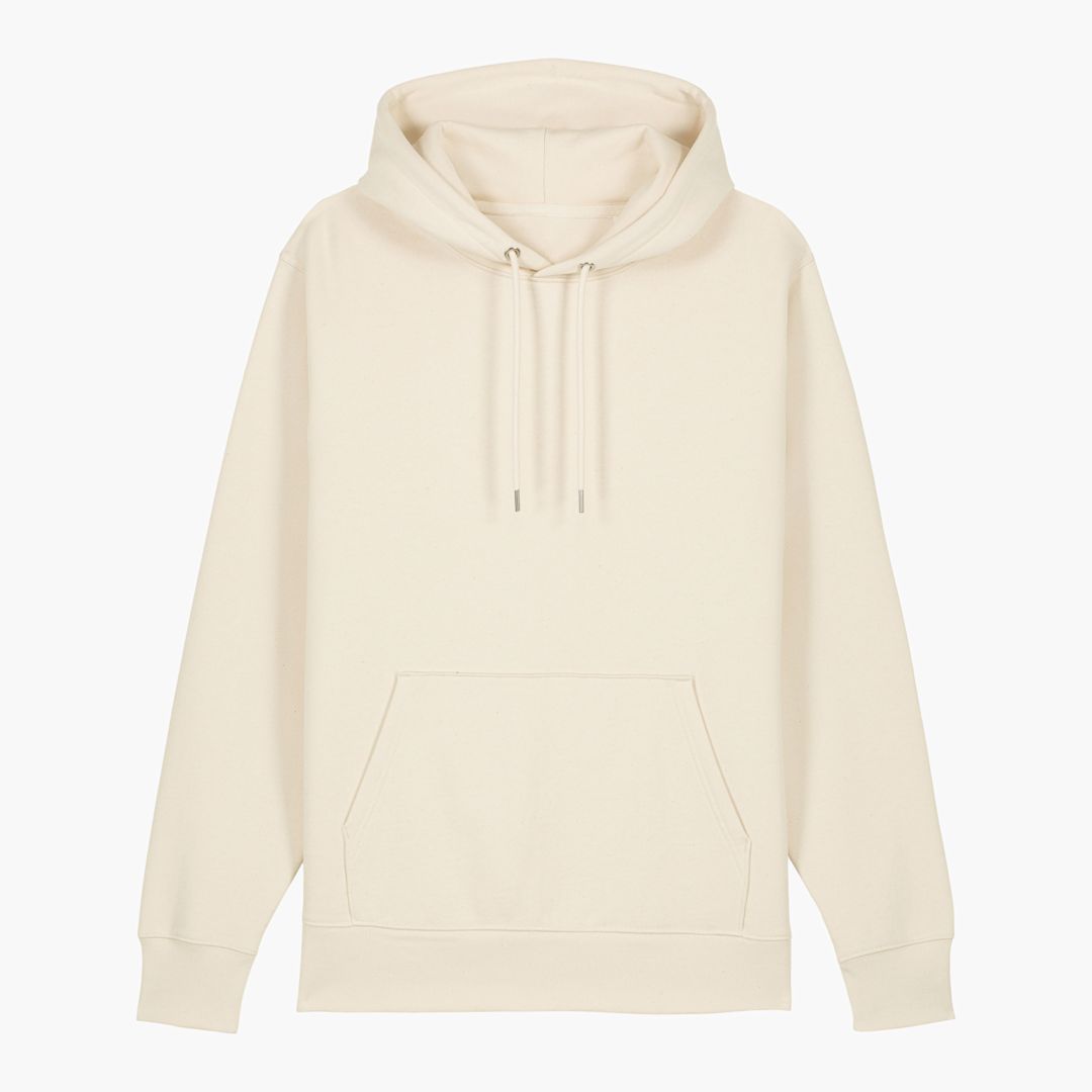 unisex hoodie sweatshirt. medium fit. 100% brushed organic Cotton. Double self fabric lined hood- Round drawcords in matching body colour. Closed end metal tipping and metal eyelets. Herringbone tape at insde back neck seam. Self fabric half moon at back neck.