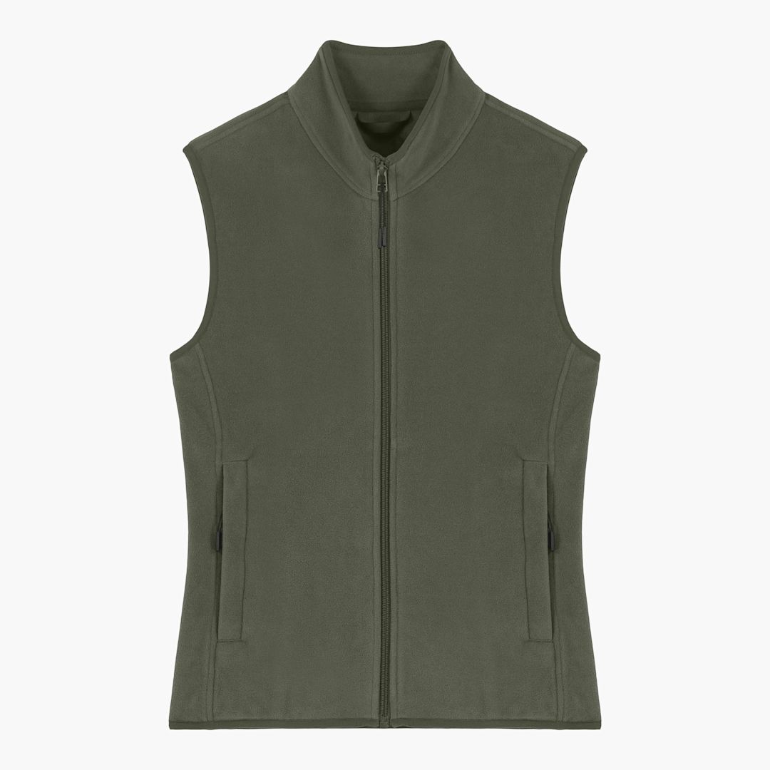 women's fleece vest. fitted style. 100% brushed recycled Polyester. 300gsm. Front side welt pockets with zip opening.
