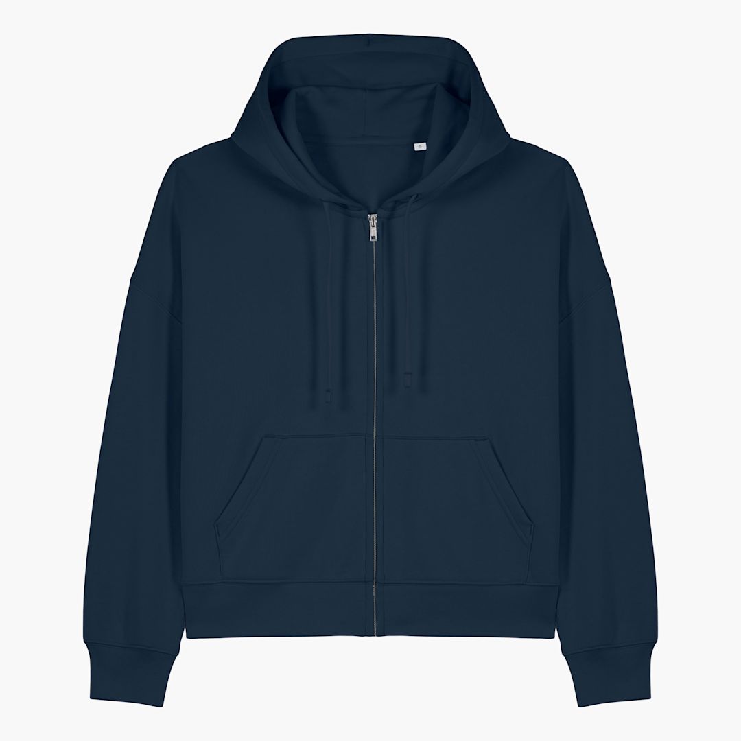 women's zip hoodie. slightly boxy fit. 100% Organic Ring Spun Combed cotton 300gsm. Dropped shoulders. Double layered hood in self fabric. Flat drawcord in matching body colour. Embroidered eyelet. Covered metal zipper at center front 1X1 ribs at collar, sleeves cuffs and bottom hem.